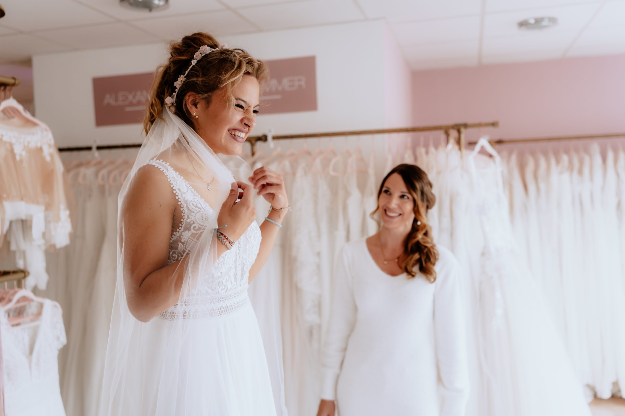 Auf dem hauseigenen Laufsteg hast du im deckenhohen Spiegel die Möglichkeit dich in deinem perfekten Brautkleid von allen Seiten in Ruhe zu betrachten. Zudem habe ich verschiedene Accessoires, wie Schleier oder Diademe, vor Ort um dich vollends in eine Braut zu verwandeln.